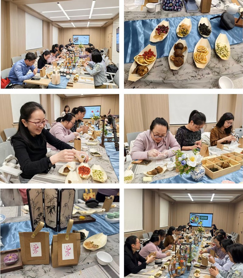在活动讲座环节,养生专家给大家介绍了玫瑰、桑葚、薄荷、胎菊等七种花草的性味与功效,提供“清嗓润喉方”“护眼方”“清热解毒方”等多种参考配方;参与教师可以按需求自主配伍,现场完成个人的专属茶包制作。