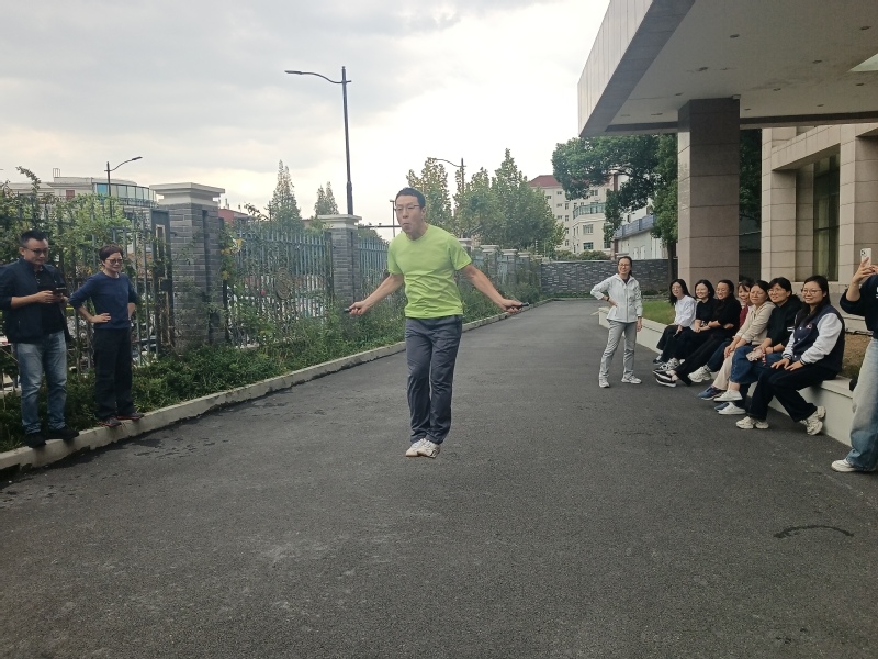 赛场节奏随后转入“轻巧对决”,踢毽子与单人跳绳项目接连登场。踢毽子环节,每队三名选手齐上阵,彩色的毽子在老师们的脚尖翻飞传递,划出一道道灵动的弧线。有的参赛组队友之间配合默契,技艺娴熟。毽子仿佛被施了魔法,象小精灵一样在队员之间“欢快”跳跃;有的则略显生疏,但队员们依然认真对待每一次尝试,其不屈不挠的精神感染了现场观众。单人跳绳项目同样精彩,选手们手握跳绳快速飞动,双脚在地面上踏出整齐的节奏。绳子划过空气的“嗖嗖”声与计数声交织,仿佛演奏着一首扣人心弦的乐章。这不仅是技巧的比拼,更是耐力的较量,有的老师跳到后半段额头满是汗水,却依旧咬牙坚持,展现出商学院人坚韧顽强的不屈精神。