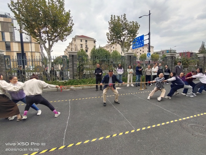 作为压轴项目,拔河比赛无疑是整场赛事的“燃点”。各队队员们紧紧握住粗绳,双脚蹬地、身体后倾,摆出全力以赴的必胜姿态。“预备——开始!”随着裁判口令落下,绳子两端的队伍瞬间发力,红色标记在中线两侧来回移动。“一二!加油!一二!加油!”领队的口号声铿锵有力,队员们咬紧牙关,脸涨得通红,手臂上的肌肉紧绷,每个人都在为团队拼尽全力。场边观众也彻底沸腾,有的挥舞着双手呐喊,有的甚至跟着节奏跺脚助威,整个赛场变成了欢乐的海洋。对手们在比赛时的“怒目”相对,在赛后瞬间化为输赢之外的“握手言欢”,彼此鼓励,相互问候,加深了彼此之间的深情友谊。