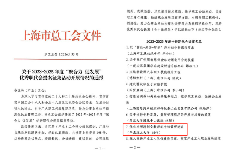 近日,全国厂务公开协调小组办公室通报表扬了2023—2025年度“聚合力 促发展”全国职工代表优秀提案征集推荐活动评选结果。我校教代表、社会与公共管理学院刘伟老师的《优化对预聘制女教师的考核管理建议提案》脱颖而出,成功入选,展现了学校职工代表参与民主管理、建言献策的能力与扎实成效。该提案同时获得上海市总工会2023-2025年度十佳职代会提案。